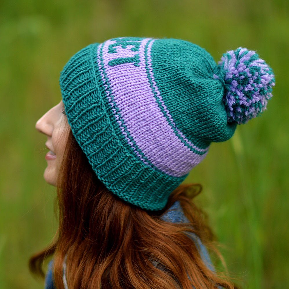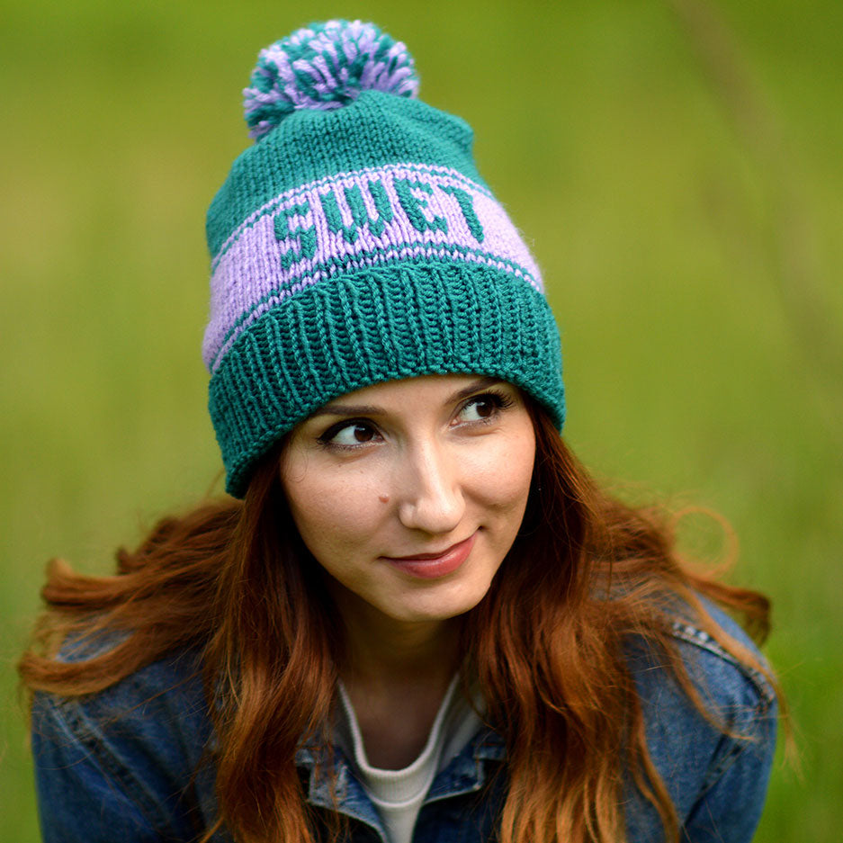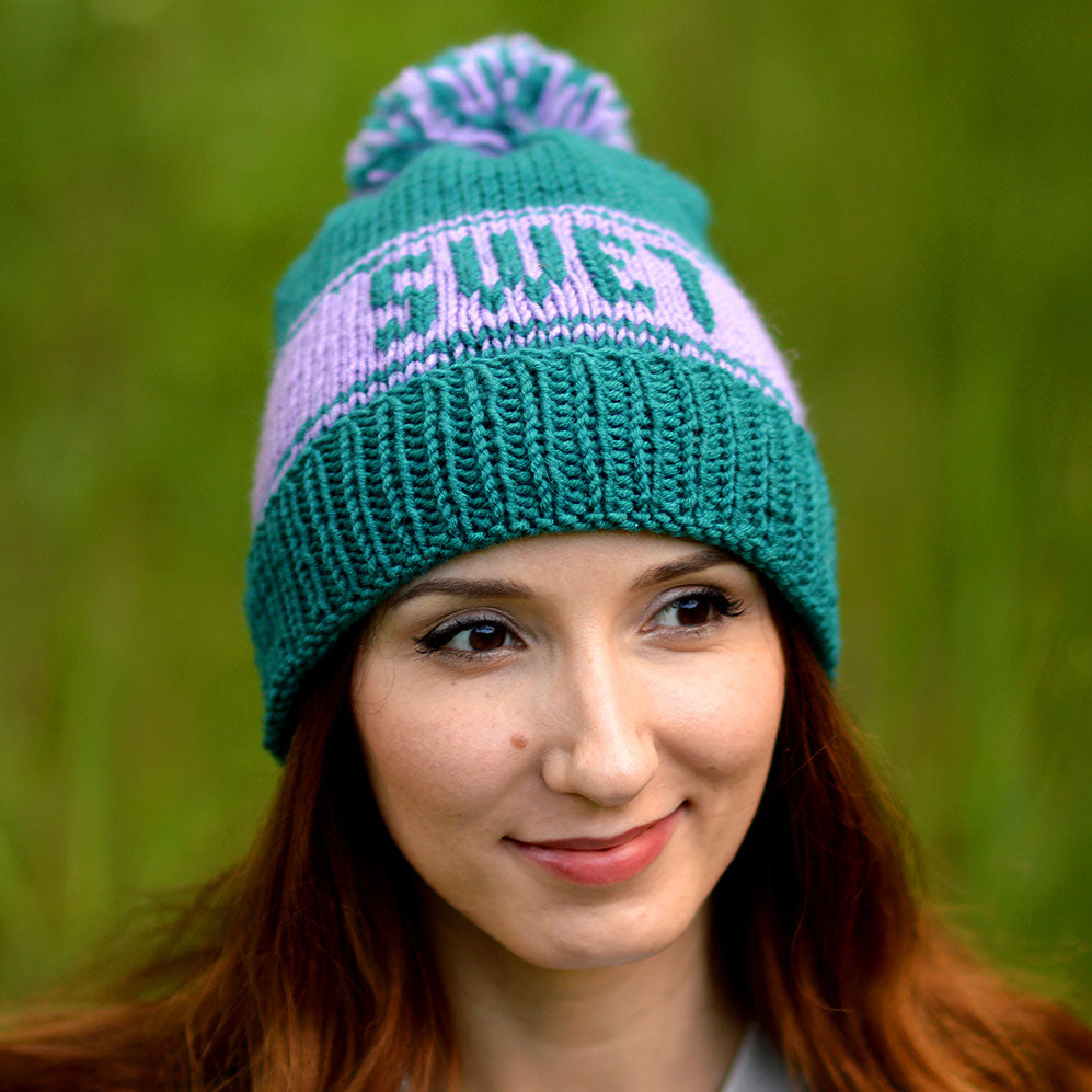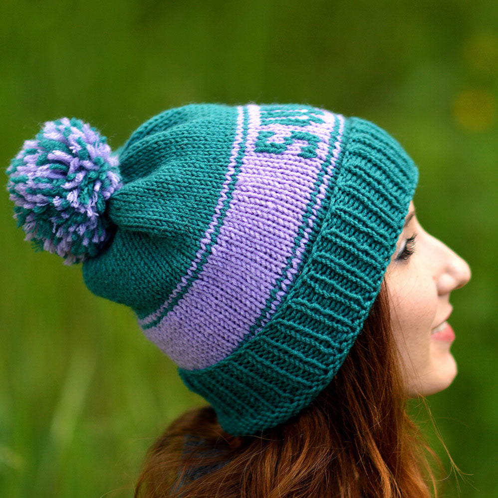 Custom knit hat with your name or company name or else. Personalized beanie with pom pom and your text. Handmade custom winter hat by StopFrost. Name hat is great as a gift for her or for some events or just a hat for every day. You can also set other colors for your custom hat. Handcrafted custom beanie with name. Embroidered hat with pom pom. I used turquoise teal yarn and light purple yarn.