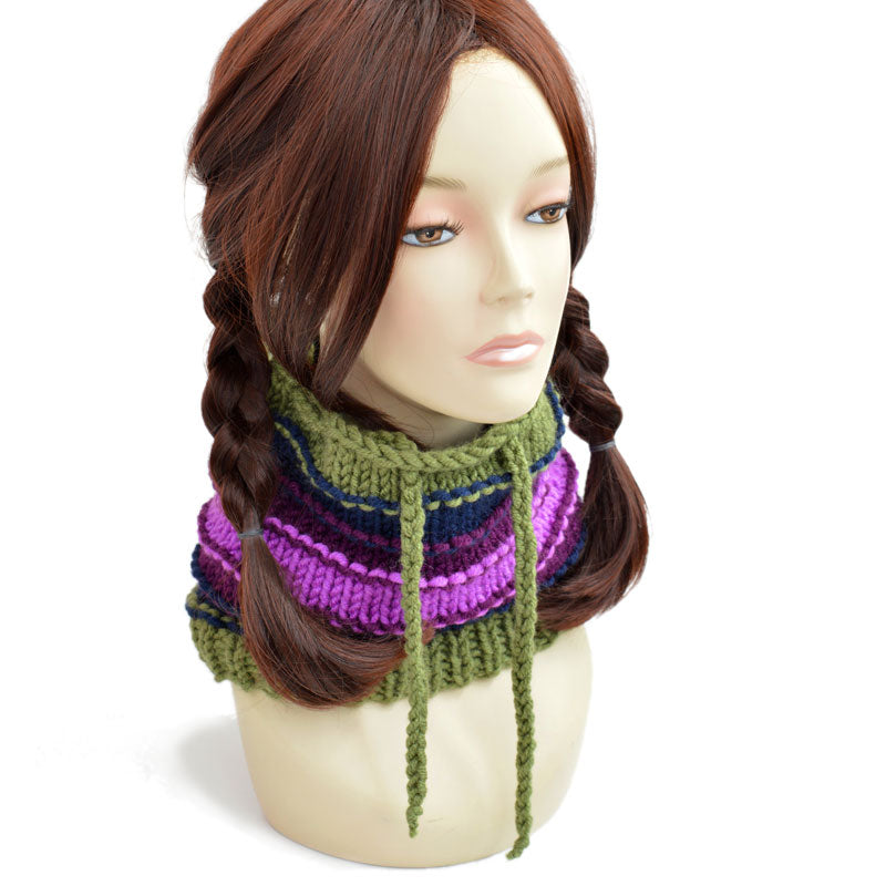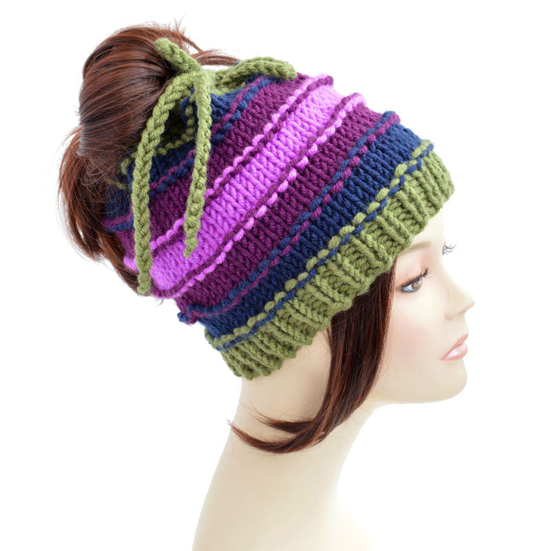 Knitted ponytail hat scarf from StopFrost, customizable colorful hat with hole. Olive green, navy blue, purple and light purple colors. Knitted ponytail hat scarf for men and women. This hole hat can also be worn without a ponytail hole by tightening the laces. Check out the benefits of our hand knitted ponytail hat scarf, choose the colors of your beanie ponytail to match your outfit.