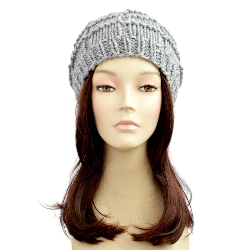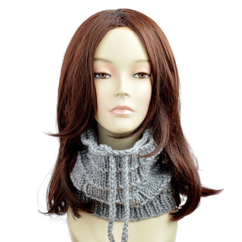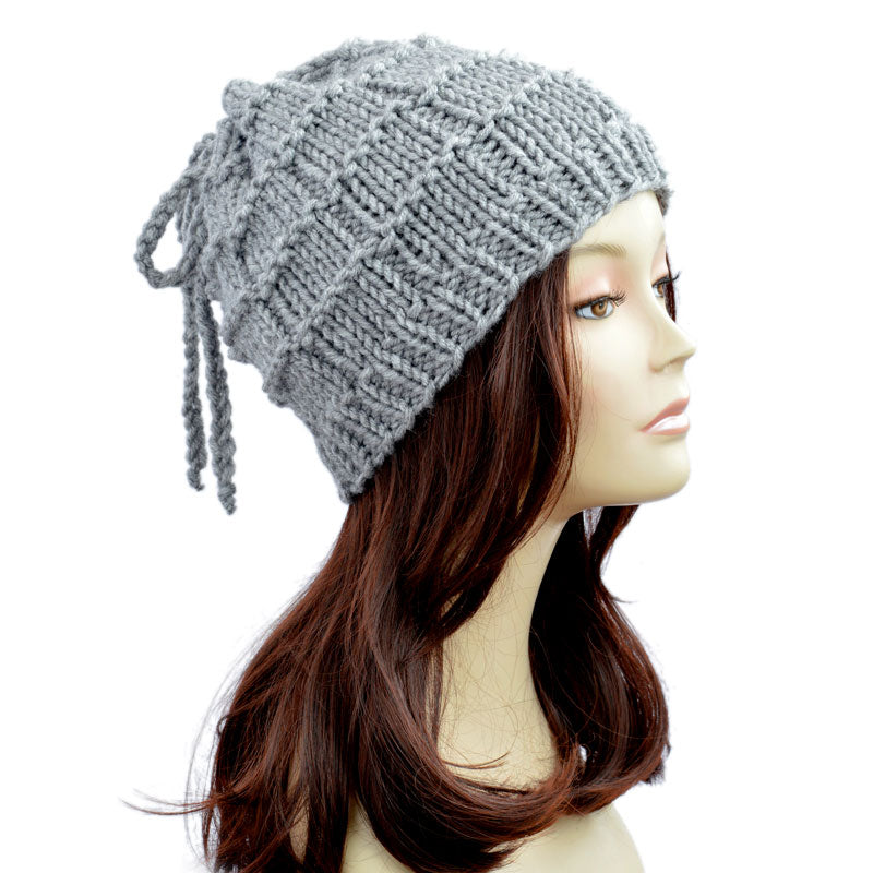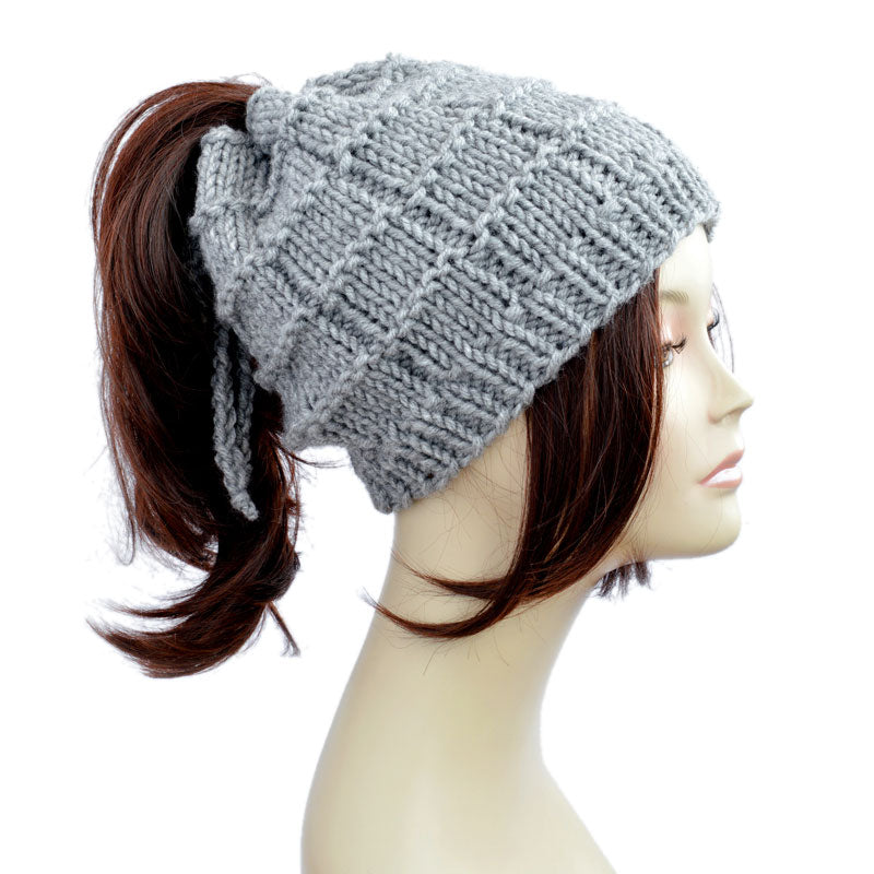 I created this ponytail hat not only as a beanie with ponytail hole but it is essentially a transformer hat as you get three in one — ponytail hole hat, regular beanie with ties above and hat scarf. This ponytail hat is gray and has a pretty nice pattern. If you're looking for a womens hats or bonnet femme check out this design. Warm winter hat by StopFrost. You can change the color of your ponytail beanie to your liking. Hand knitted hat with ponytail hole will keep you warm in the cold months.
