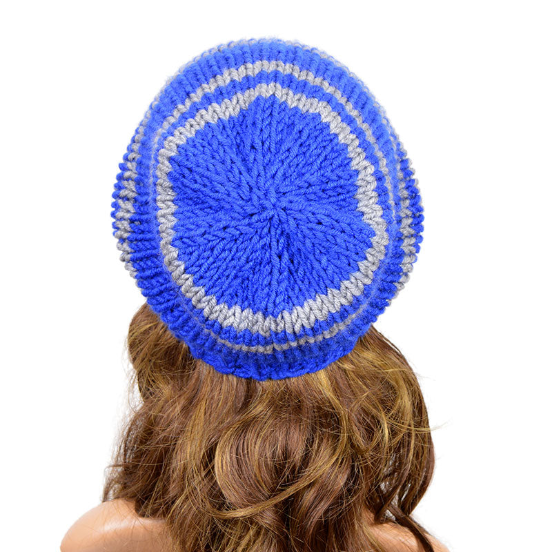 Striped slouchy beanie hat in blue and gray. Customize your striped slouchy beanie with any colors you like. Men's women's oversized beanie of any size. Hand knitted custom striped slouchy beanie from StopFrost. We are open to suggestions, contact us if you don't see the color you need for your striped slouchy beanie or if you want a design that is not in our collection of slouchy beanie.