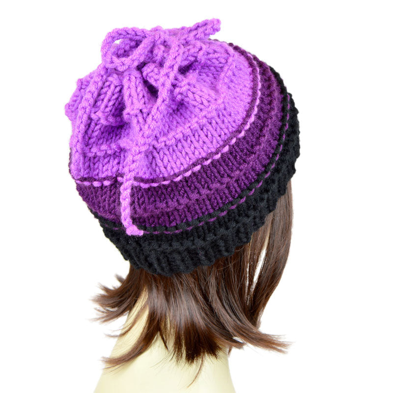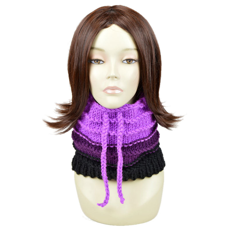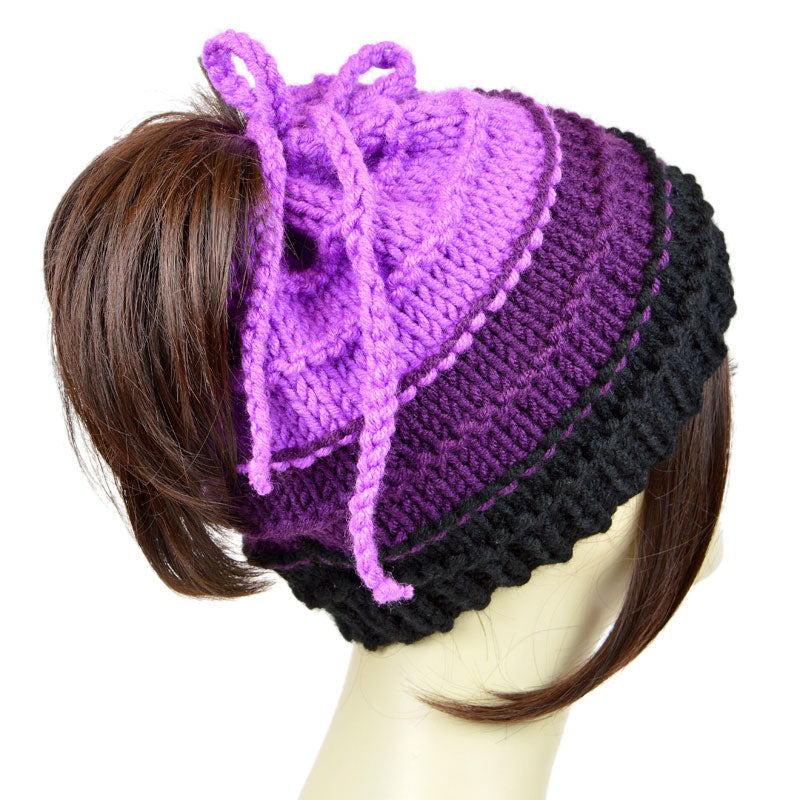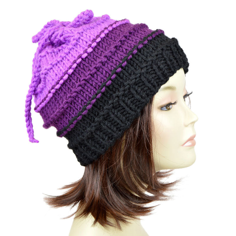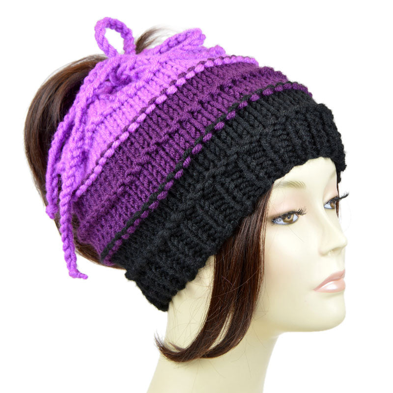 Ursula beanie for adults women in black and purple hat colors. All sizes are available for your Ursula beanie for adults. You can customize the colors for the final Ursula beanie for women. Ponytail hat with ombre from light purple to black. The Ursula beanie adults can be worn in three different ways, as a hat with ties at top, as a scarf and as a ponytail hat. Lightweight and comfortable Ursula beanie womens will keep you warm in cold weather. Try Ursula beanie from StopFrost and enjoy the benefits of hand-knitted hats. Custom Ursula hat for winter, cold season, sea witch costume or Ursula costume.